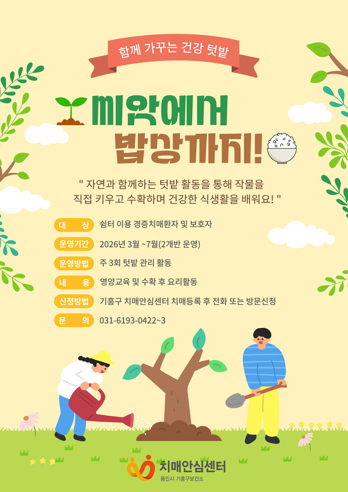 센터 관계자는 “텃밭 활동은 심리적 안정과 정서적 만족감을 높이고, 신체 활동과 인지 자극에도 도움을 줄 수 있다”며 “관심 있는 분들의 많은 신청을 바란다”고 말했다.