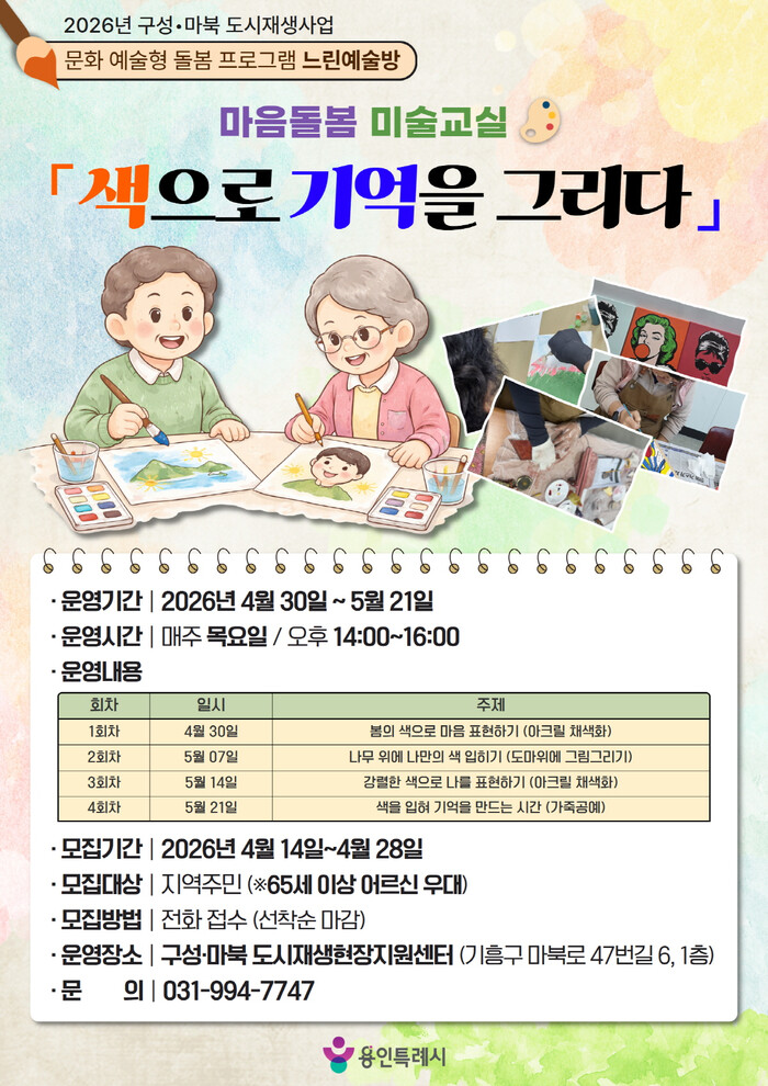 시 관계자는 “문화예술형 돌봄 프로그램은 단순한 여가활동을 넘어, 지역 주민의 관계 형성과 정서적 안정에 기여하는 중요한 사업”이라며 “주민이 체감할 수 있는 다양한 도시재생 프로그램을 지속적으로 추진해 나가겠다”고 말했다.