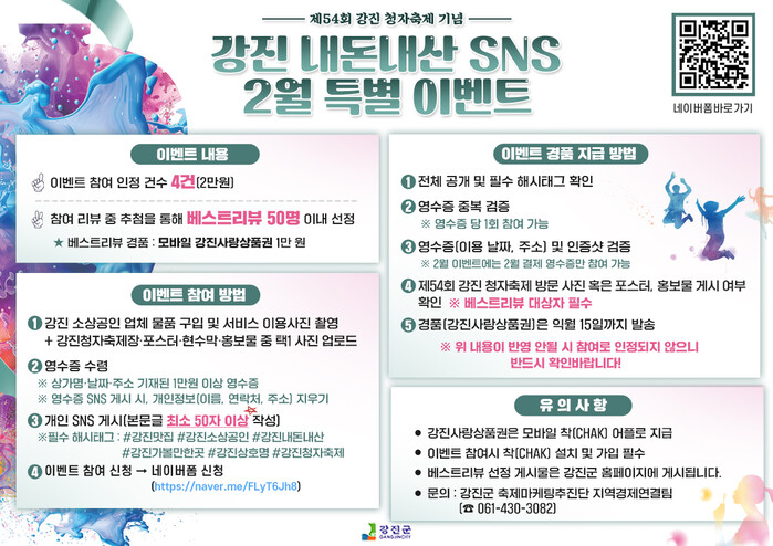 ‘강진군 내돈내산 SNS 리뷰 이벤트’는 소비자가 강진군 소상공인 업체 이용 후 SNS에 사진(이용 및 영수증)과 리뷰를 작성하면 모바일 강진사랑상품권을 1건당 5000원을 지급하는 내용으로, 지난 2025년 1년간 1793명의 참여자가 4543건의 리뷰를 작성해, 강진군 소상공인을 홍보하고 혜택을 받아 갔다.
