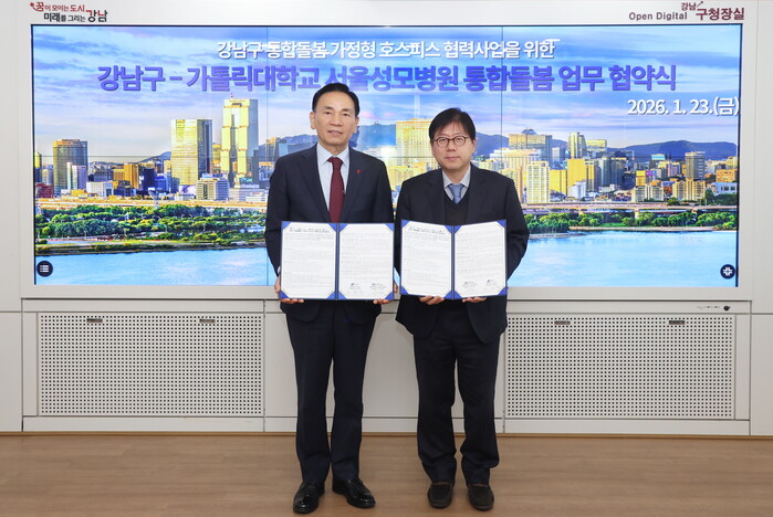 [시민일보 = 이대우 기자] 서울 강남구(구청장 조성명)가 구청에서 가톨릭대학교 서울성모병원과 ‘강남구 통합돌봄 가정형 호스피스 협력사업’ 추진을 위한 업무협약(MOU)을 체결했다.