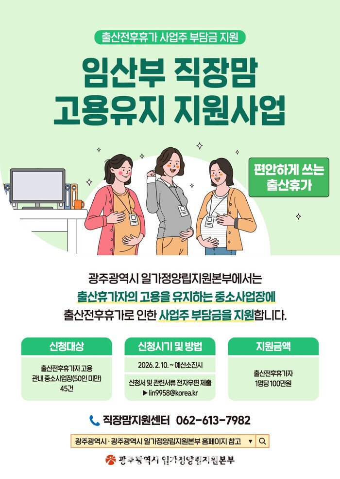 지원 대상은 출산 전후 휴가 기간 임산부의 고용을 유지하는 광주지역 50인 미만 중소사업장이며, 임산부 직원 1명 당 100만 원을 지원한다.
