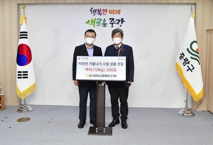 서울 중랑구는 20일 동서울농협으로부터 2022 희망온돌 따뜻한 겨울나기 성품으로 720만원 상당의 백미(10kg) 200포를 전달받았다. 성품은 서울사회복지공동모금회를 통해 지역내 어려운 이웃을 위해 사용될 예정이다. 사진은 류경기 구청장(왼쪽)이 박유선 조합장과 기념촬영을 하는 모습. (사진제공=중랑구청)