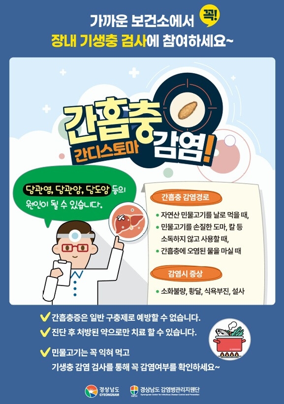 안명기 보건소장은 “민물고기를 반드시 익혀먹고, 칼, 도마 등 조리용 기구는 소독하며 손씻기 등 개인위생 수칙을 철저히 지키는 것이 중요하다”며 “민물회를 즐기는 주민들은 이번 무료 검진에 적극 참여해 조기발견과 예방에 힘써달라”고 말했다.