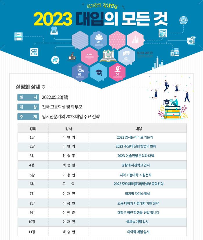 [시민일보 = 이대우 기자] 서울 강남구가 운영하는 인터넷수능방송(이하 강남인강)이 수험생과 학부모에게 최신 대학입시 정보를 제공하기 위해 ‘2023 대입의 모든 것’ 온라인 입시설명회를 개최했다.
