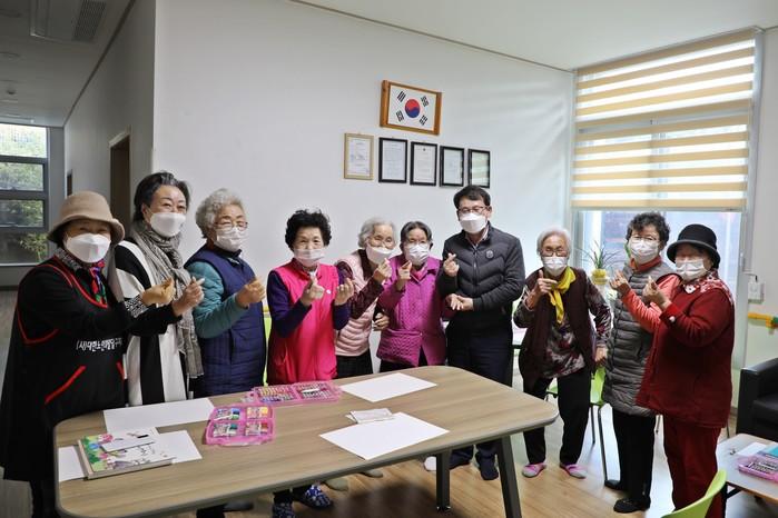 경기 수원시 팔달구 백운오 구청장은 8일 단계적 일상 회복의 전환에 따른 경로당 여가 프로그램 재개에 따라 지역내 남수연화 경로당을 방문해 노인들을 격려했다. 사진은 이날 백 구청장(오른쪽 네 번째)이 노인들과 함께 기념촬영을 하는 모습. (사진제공=팔달구청)