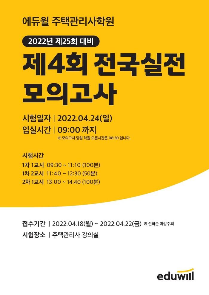 [시민일보 = 여영준 기자] 에듀윌 주택관리사학원은 2022년 제25회 주택관리사 시험 대비를 위한 제4회 전국 실전 모의고사 응시생을 모집한다고 밝혔다.