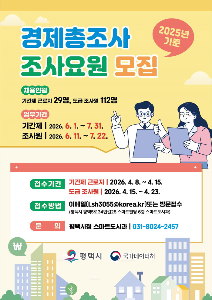 [평택=오왕석 기자] 평택시(시장 정장선)는 오는 8일부터 23일까지 ‘2025년 기준 경제총조사’ 현장 조사 업무를 담당할 조사요원을 모집한다.