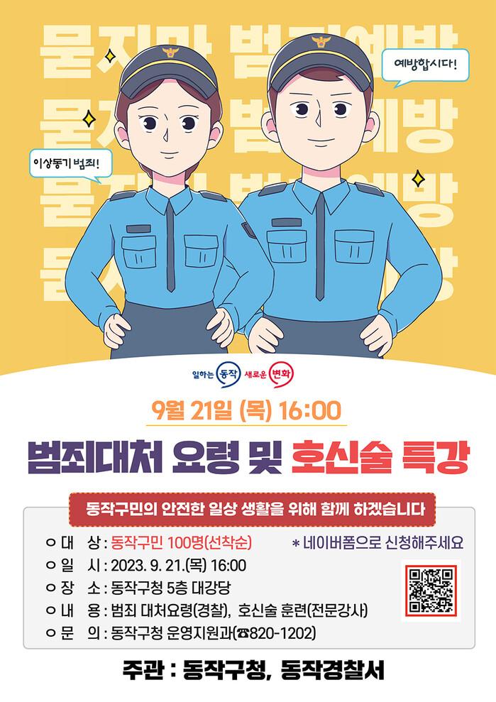 [시민일보 = 여영준 기자] 동작구(구청장 박일하)는 구민의 안전한 일상생활을 위해 오는 21일 구민을 대상으로 ‘범죄대처 요령 및 호신술 모의 훈련’을 실시한다고 밝혔다.