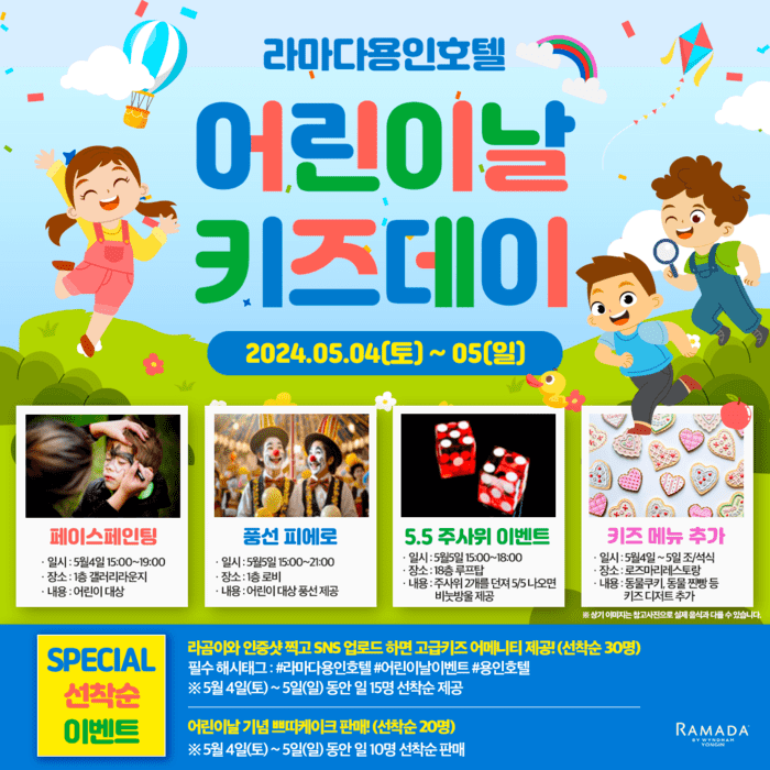 이외에도 라마다용인호텔의 시그니처인 ‘라곰이’와 인증샷을 찍고 SNS에 업로드하면 선착순 30명에게 친환경 고급 키즈 어메니티를 제공하며, 호텔 1,2층 입구에 캐릭터 풍선 포토존을 설치해 어린이날의 즐거운 분위기를 호텔 곳곳에서 느낄 수 있을 예정이다.
