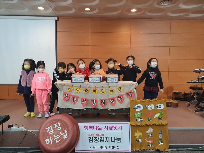광진구 중곡3동 주민센터는 최근 ‘예아랑 어린이집’ 주관으로 저소득층 구민들의 따뜻한 겨울나기를 기원하기 위한 ‘행복의 김장김치 나눔 전달식’을 열었다. 어린이들은 지역내 저소득층 6가구를 위해 김장김치를 담가 동주민센터에 전달했다. 사진은 전달식에서 어린이들이 기념촬영을 하는 모습. (사진제공=광진구청)