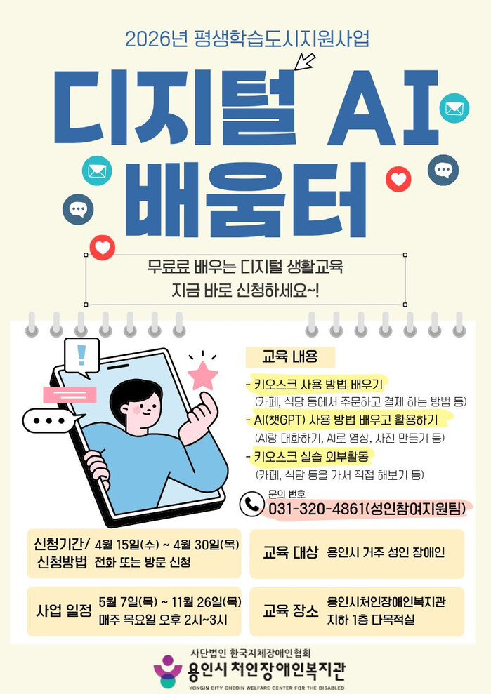 [용인=오왕석 기자] 용인시처인장애인복지관(관장 이선덕)은 ‘2026년 디지털 AI 배움터’ 참여자 모집을 오는 4월 15일부터 4월 30일까지 진행한다고 밝혔다.