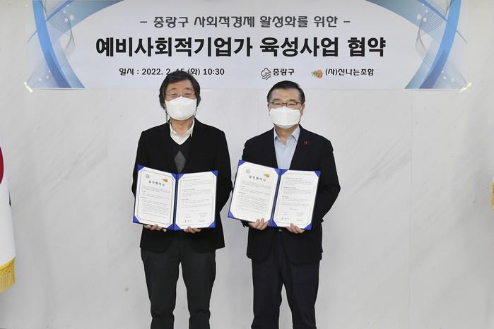 중랑구는 지난 15일 사단법인 한국 마이크로크레디트 신나는조합과 사회적경제 생태계 활성화를 위한 업무협약을 체결했다. 협약을 통해 구는 센터내 창업 인큐베이팅 공간을 제공하고 신나는조합에서 창업팀을 대상으로 각종 프로그램 운영을 맡게 된다. 사진은 협약식에서 류경기 구청장(오른쪽)과 이선우 이사장이 기념촬영을 하는 모습. (사진제공=중랑구청)
