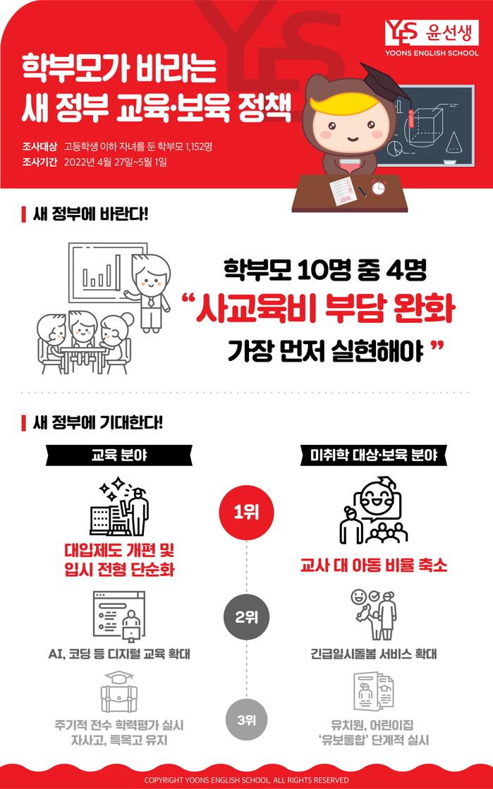 영어교육 전문기업 윤선생은 지난 4월 27일~이달 1일 고등학생 이하 자녀를 둔 학부모 1152명을 대상으로 설문조사를 실시한 결과, 전체 응답자의 38%가 ‘사교육 의존 현상 완화 및 사교육비 부담 경감’을 새 정부의 교육 분야 최우선 실현 과제로 꼽았다고 11일 밝혔다.
