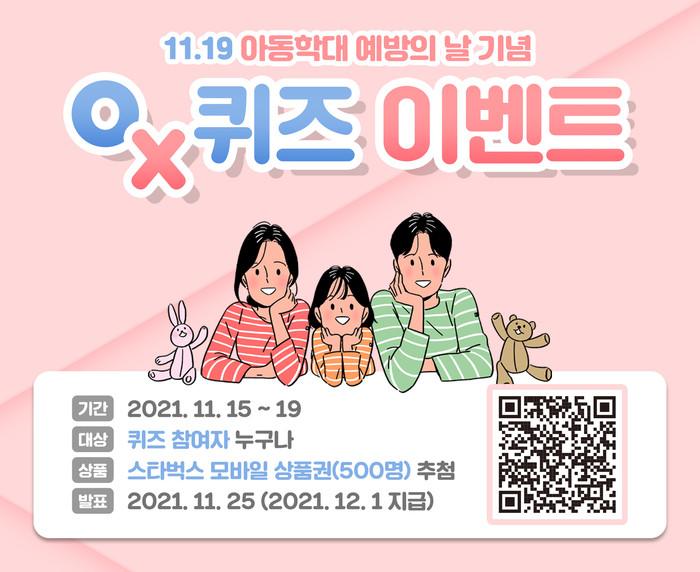 우선 온라인 퀴즈이벤트는 15~19일 강남구청 홈페이지에서 ‘아동학대, 우린 어디까지 알고 있을까?’를 주제로 진행되며 추첨을 통해 500명에게 커피 기프트콘을 증정한다.
