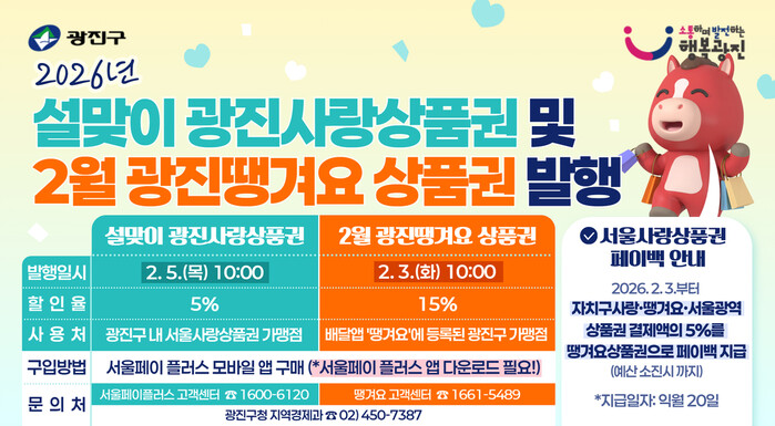 [시민일보 = 여영준 기자] 광진구(구청장 김경호)는 설 연휴를 앞두고 구민의 소비 부담을 줄이고 지역 상권에 활력을 불어넣기 위해 ‘광진땡겨요상품권’ 6억원과 ‘광진사랑상품권’ 100억원, 총 106억원 규모의 상품권을 잇달아 발행한다고 밝혔다.