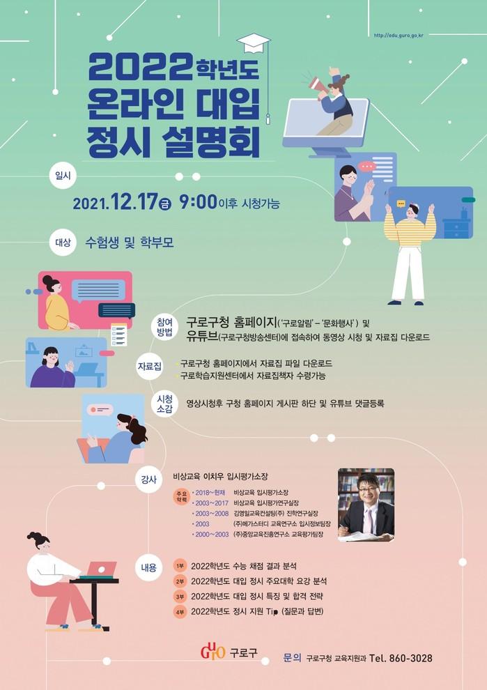[시민일보 = 이대우 기자] 서울 구로구(구청장 이성)가 오는 17일 오전 9시 유튜브 채널 ‘구로구청 방송센터’와 구 홈페이지를 통해 ‘2022학년도 온라인 대입 정시설명회’를 개최한다.