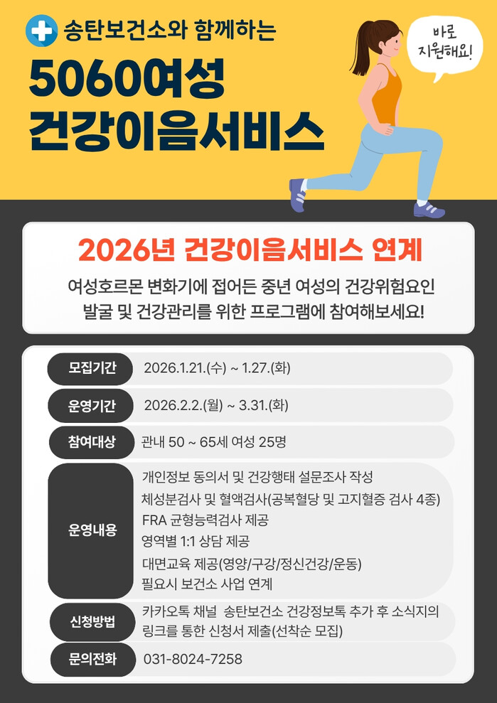 송탄보건소 ‘5060여성 건강이음서비스’ 사업의 내용 및 신청은 카카오톡 채널 「송탄보건소 건강정보톡」을 통해 알 수 있으며, 자세한 사항은 전화로 문의하면 된다.