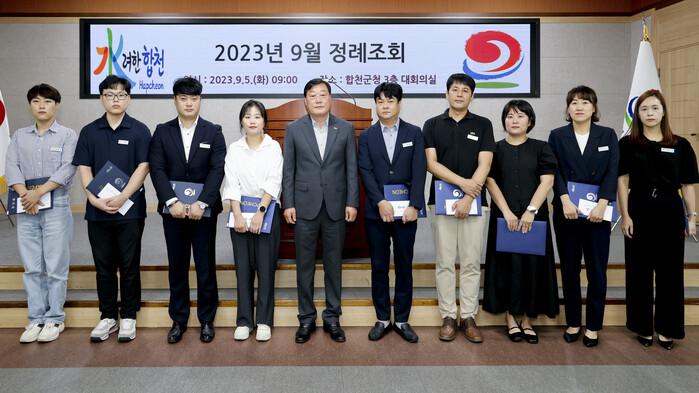 이번 정례조회에서는 국도정 유공 공무원 및 민간인 5명(▲2023년 상반기 정부모범공무원 2명 ▲산림보호 유공 2명 ▲2023년 지방재정 집행추진 유공 1명) 및 군정 유공 공무원 9명(▲군정발전 아이디어 공모 6명 ▲2023년 상반기 민원처리 마일리지 운영 우수공무원 3명)에게 표창장을 수여했다.