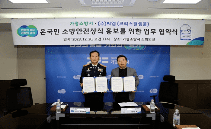 또한 가평소방서와의 협약을 통해 소방 인력의 안전을 돕고, 재난 발생 시 신속한 대응을 위한 준비를 지원함으로써 지역 사회의 안전을 지키고 있다. 지난 12월 26일, 크리스탈샘물과 가평 소방서 주요 관계자 7명이 참석한 가운데 소방 안전 상식 대국민 홍보를 위한 업무 협약을 체결했다. 최근 잇따른 화재로 인명·재산 피해가 증가함에 따라 누구나 쉽게 소방 안전 상식을 접할 수 있는 기회를 위해 추진됐다. 가평소방서와 (주)크리스탈샘물은 협업을 통해 화재·응급처치 등 소방안전상식을 효과적으로 홍보하여 화재로 인한 각종 피해를 예방하고, 기업은 사회공헌활동 참여로 기업의 지역 상생 경영과 긍정적인 이미지 구축에 기여할 전망이다.