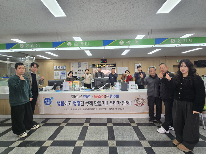 작년 추석 명절에 이어 2026년 병오년 새해에도 쌍책면은 동부농협 쌍책지점(지점장 이종원), 쌍책우체국(국장 이수원), 쌍책초등학교(교장 천석규)와 함께 주민들을 대상으로 청렴에 대한 굳은 실천 의지를 전했다.