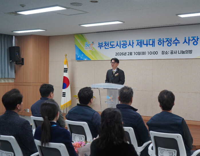 | 부천도시공사 신임 하정수 사장이 취임사를 하고 있다. [사진=부천도시공사] |