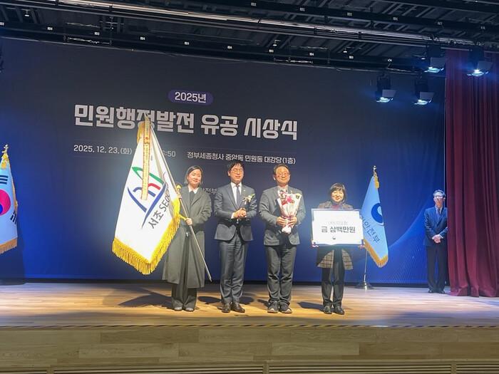 [시민일보 = 박소진 기자] 서초구(구청장 전성수)는 지난 23일 정부세종청사에서 열린 행정안전부 주관 ‘2025 민원행정발전 유공 시상식’에서 오케이민원센터가 국민행복민원실 최우수기관으로 ‘대통령상’을 수상했다고 밝혔다.