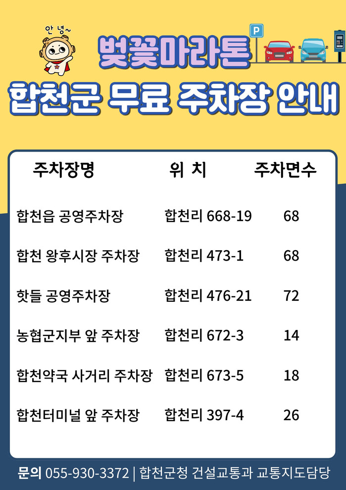 김윤철 합천군수는 “합천벚꽃마라톤행사를 즐긴 방문객에게 합천군의 좋은 이미지를 남길 수 있도록 쾌적한 주차 편의를 제공에 최선을 다하겠다”고 말했다