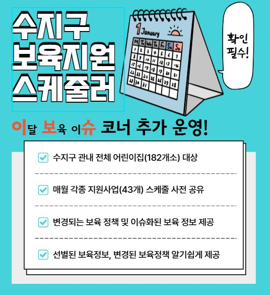 [용인=오왕석 기자] 용인특례시(시장 이상일) 수지구는 보육 정책 등을 알기 쉽게 정리한 ‘보육지원 스케줄러’에 이달 보육 이슈 항목을 신설했다고 15일 밝혔다.
