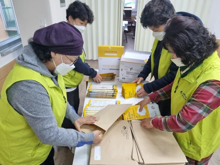 경기 양평군 지평면 지역사회보장협의체가 최근 ‘코로나19 극복을 위한 취약계층 마스크 배분 사업’으로 마스크 포장 봉사활동을 했다. 이날 협의체 봉사자들은 KF94 마스크 1320장을 봉투 포장과 주소 라벨 작업을 했으며, 포장된 마스크는 지역내 취약계층 132가구에 우편 배송될 예정이다. 사진은 이날 봉사자들이 마스크를 포장하고 있는 모습. (사진제공=양평군청)