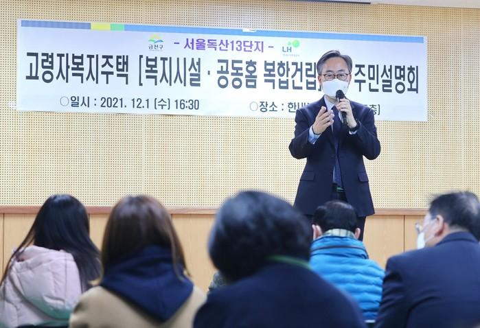 서울 금천구가 지난 1일 ‘독산13단지 고령자복지주택(복지시설·공동홈 복합건립)’ 사업 주민설명회를 열고 그동안의 사업추진 경과와 설계 내용을 설명하고, 주민들의 의견을 듣는 시간을 보냈다. 사진은 설명회에서 유성훈 구청장이 사업설명을 하고 있는 모습. (사진제공=금천구청)