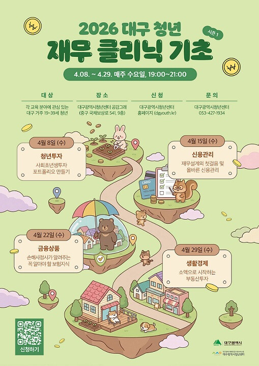 [대구=박병상 기자] 대구광역시는 지역 청년들의 금융 역량을 강화하고 안정적인 자산 형성을 뒷받침하기 위해 ‘대구 청년 재무클리닉’ 사업을 본격 추진한다.
