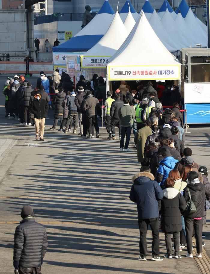 신종 코로나바이러스 감염증(코로나19) 누적 확진자가 100만명을 넘어선 6일 오전 서울역 임시선별검사소에서 시민들이 검사를 위해 줄을 서있다. 중앙방역대책본부는 이날 0시 기준으로 확진자가 3만8691명 늘어 누적 100만9688명이라고 밝혔다.
