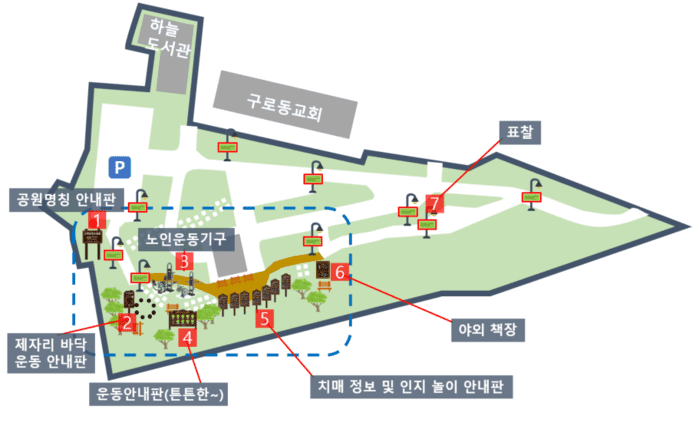 구는 구로2동 기억튼튼공원에 치매 예방을 위한 치매정보 게시판, 치매관리 표찰, 운동‧인지관리 안내판, 노인운동기구 등 다양한 시설물을 설치했다.