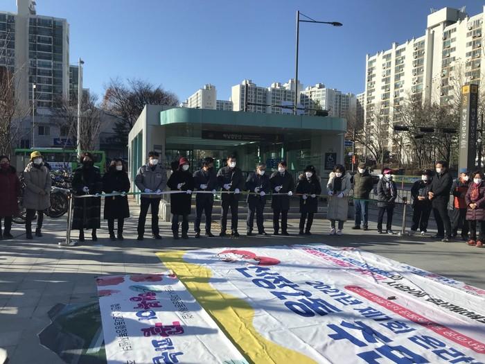 경기 하남시 신장2동 주민자치회가 최근 신장2동만의 자연환경과 랜드마크를 방위에 맞춰 제작한 안내지도 제막식을 열었다. 이번 제막식은 주민참여 시범사업으로 선정된 안내지도 제작을 기념하기 위해 마련했다. 사진은 제막식에서 관계자들이 테이프 커팅을 하고 있는 모습. (사진제공=하남시청)