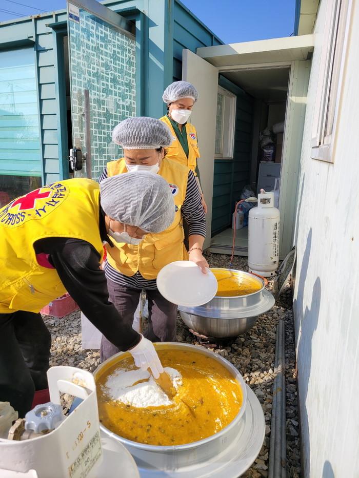 충남 아산시 온양6동 적십자봉사회는 최근 겨울나기를 기원하며 지역내 취약계층 40가구에 직접 조리한 호박죽을 나누고 안부 모니터링을 했다. 사진은 이날 봉사자들이 호박죽을 만들고 있는 모습. (사진제공=아산시청)