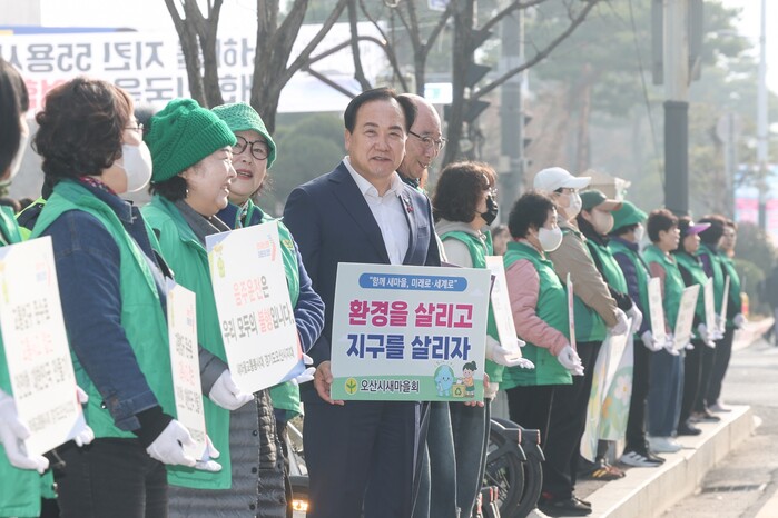 경기 오산시 새마을교통봉사대와 새마을지도자 오산시 부녀회가 최근 오산시청 정문 앞 사거리에서 정지선 지키기와 등굣길 교통안전 확보를 위한 합동 캠페인을 실시했다. 사진은 캠페인에 참여한 이권재 시장(왼쪽 네 번째)의 모습. (사진=오산시청 제공)
