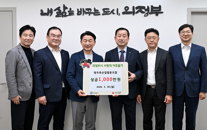 경기 의정부시가 지난 30일 양주축산업협동조합으로부터 저소득층을 위한 성금 1000만원을 기탁받았다. 사진은 성금 전달식에서 김동근 시장(왼쪽 세 번째)이 관계자들과 함께 기념 촬영을 하는 모습. (사진=의정부시청 제공)