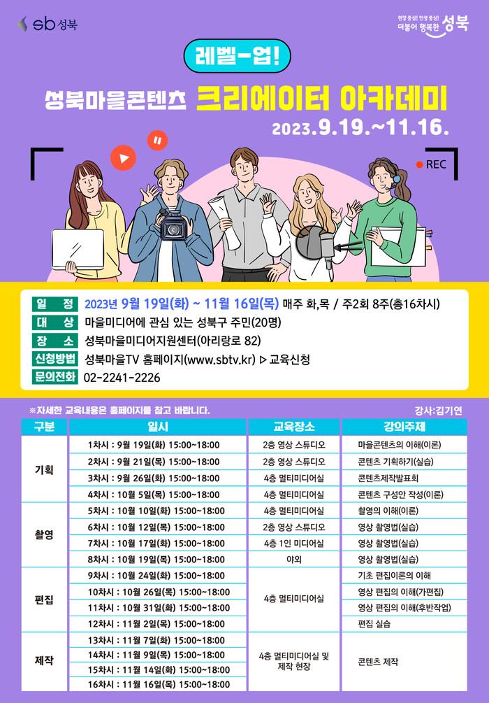 ‘성북마을콘텐츠 크리에이터 아카데미’를 오는 9월 19일부터 11월 16일까지 성북마을미디어지원센터(성북구 아리랑로 82)에서 진행한다.