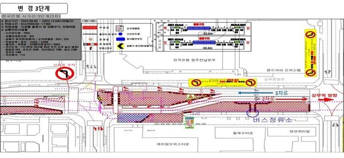 [광주=정찬남 기자] 광주광역시 도시철도건설본부는 오는 27일부터 단계별 교통처리 계획에 따라 상무중앙로 한국은행 사거리 교통전환을 실시한다.