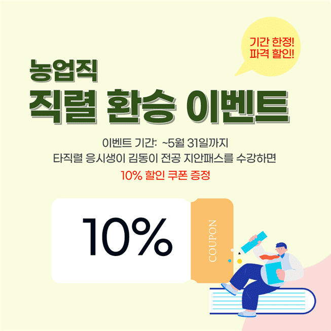 ‘대한민국 브랜드파워 1위’에서 계리직 공무원 부문 1위에 선정된 ‘지안에듀’는 농업직 이외에 △전산직 △토목직 △계리직 △농업직 △조경직 △군무원 전산직 △군무원 통신직 △통신직 등 기술직도 직종별 180 지안패스 구매를 통해 공통과목 이론서 무료 증정과 함께 배수제한 없이 무한 수강이 가능하다.