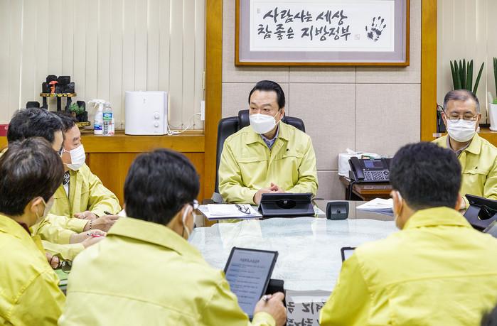 노현송 서울 강서구청장은 8일 ‘코로나19 긴급 대책회의’를 열고 오미크론 변이 바이러스 확산세 차단을 위한 총력 대응을 주문하고 신속항원검사 운영 현황 등 코로나19 대응체계 전반에 대해 집중 점검했다. 사진은 노 구청장(가운데)이 회의를 주재하고 있는 모습. (사진제공=강서구청)