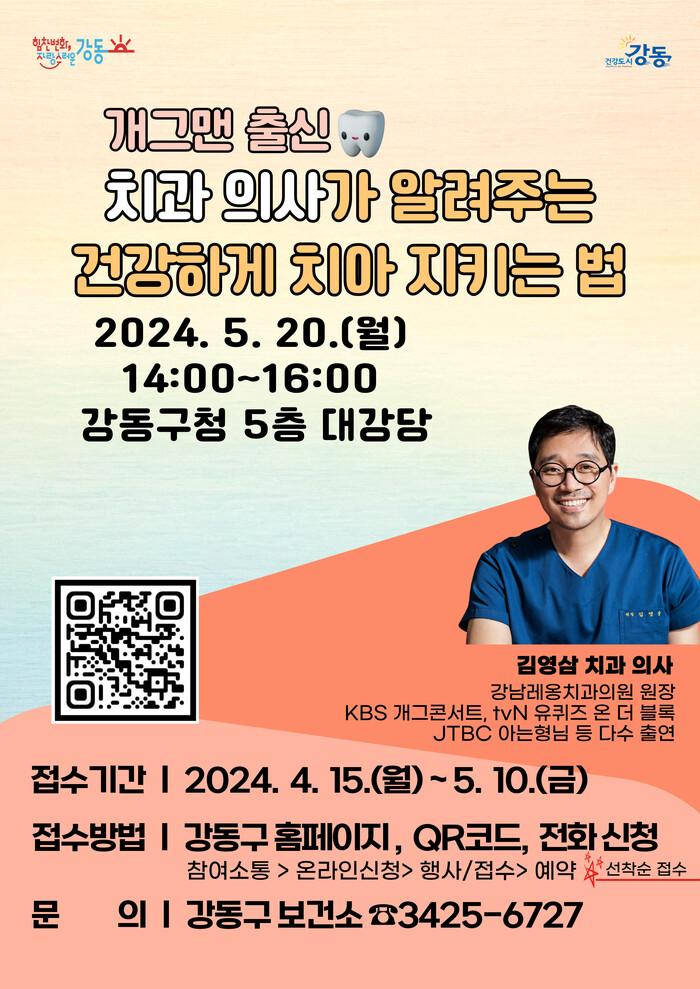 이번 특강에는 개그맨 출신 김영삼 치과의사가 강사로 나서 치아 관리의 중요성과 실천 방법을 구민에게 전달한다. 유쾌한 강의로 유명한 김영삼 치과의사가 그만의 재치 있는 말솜씨로 일상 속에서 쉽게 실천할 수 있는 치아 관리법을 소개하고, 구강 건강의 중요성을 전달할 예정이다.