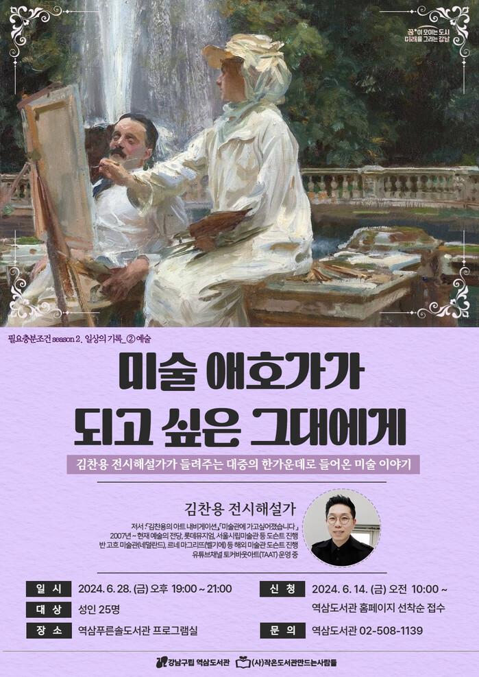6월 강연은 「미술관에 가고 싶어졌습니다」의 저자 김찬용 전시해설가가 진행하며 좋은 전시를 발견하는 팁과 전시 취향을 발견할 수 있는 감상법을 알아보고, 평범한 감상자에서 미술 애호가로 거듭날 수 있는 방법에 대해 이야기하는 시간을 가질 예정이다.