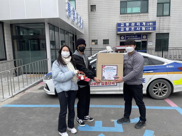 경기 포천청소년문화의집 청소년자치기구 운영위원회 ‘포커스’와 요리봉사단 ‘쿡볼’, 자원봉사단 ‘링크’가 최근 재능기부 봉사활동으로 크리스마스 리스와 쿠키 등을 만들어 청소년의 안전을 위해 애쓰는 경찰관에 대한 존경을 표현하기 위해 포천경찰서에 전달했다. 사진은 청소년들이 경찰서에 쿠키 등을 전달하고 있는 모습. (사진제공=포천시청)
