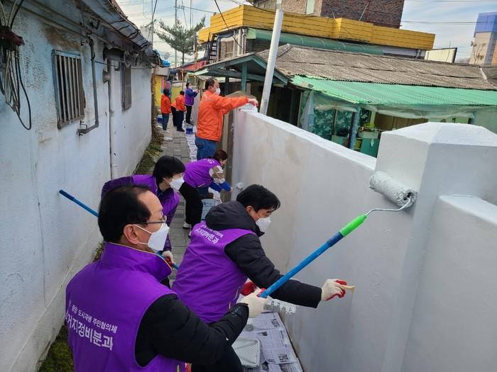 경기 동두천시 생연2동·중앙동 도시재생 주민협의체 주거지정비분과는 최근 생연동 일원의 한 골목길 담장개선 봉사활동을 진행해 골목공간에 어울리는 밝은 색상으로 채색해 벽면을 장식했다. 사진은 이날 참여한 봉사자들이 골목길 담장에 페인트칠을 하고 있는 모습. (사진제공=동두천시청)