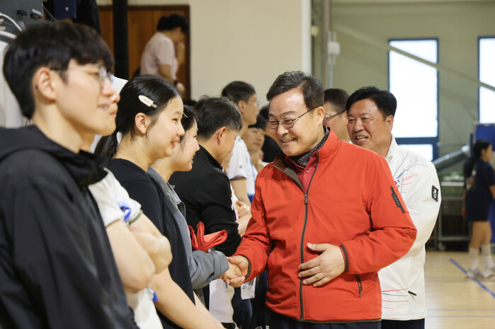| ▲ ‘2026 의왕시장배 종합체육대회’에 참석한 김성제 시장이 대회 참가자들과 악수를 하고 있다. (사진=의왕시청 제공) |