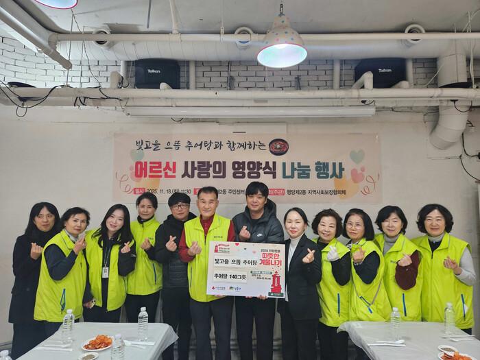 성동구 행당제2동 지역사회보장협의체가 최근 주민센터 1층 해아림에서 건강 취약 노인을 위해 영양식 나눔 행사를 개최했다. 사진은 행사에 참여한 관계자들이 기념촬영을 하는 모습. (사진=성동구청 제공)