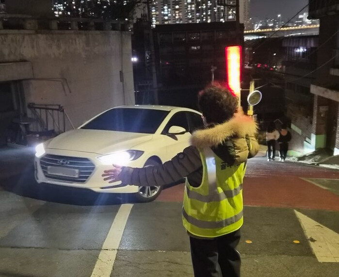 | ▲ 응봉산 골목지킴이의 교통 계도 활동 모습. (사진=성동구청 제공) |