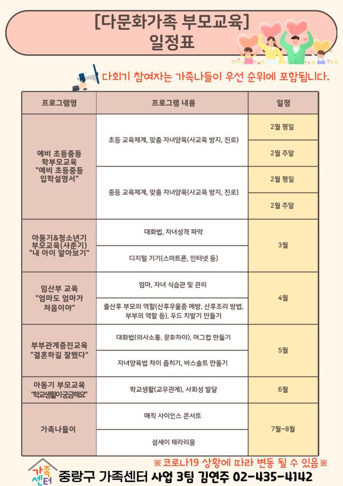 [시민일보 = 여영준 기자] 서울 중랑구(구청장 류경기)는 다문화가족의 가족 문제를 예방하고 생애주기에 따른 가족 기능을 강화할 수 있도록 '생애주기별 부모교육' 프로그램을 운영한다고 8일 밝혔다.