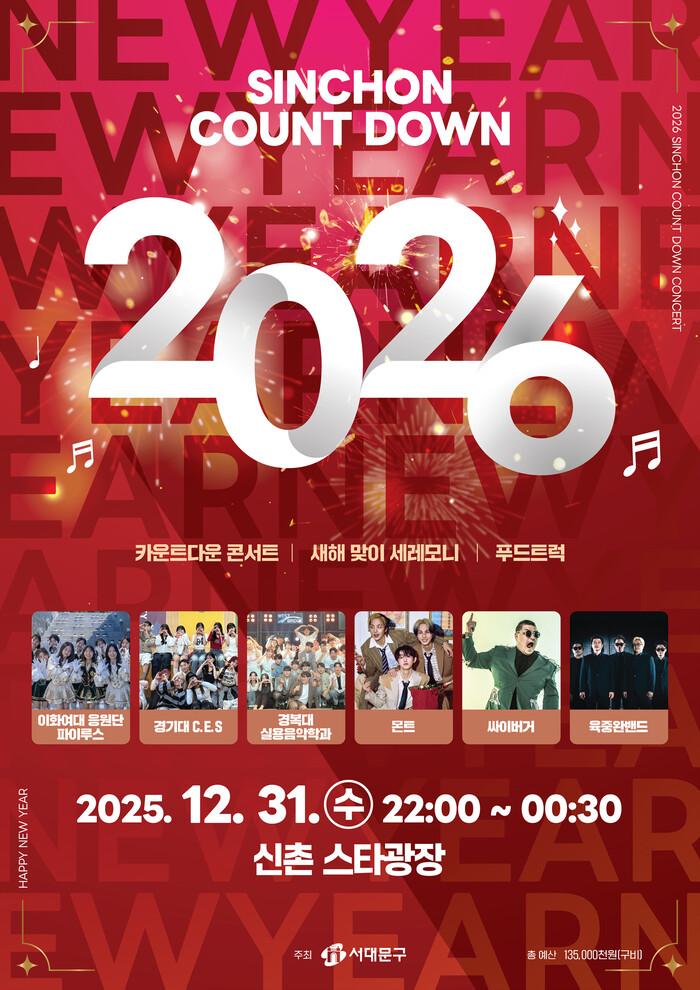 [시민일보 = 이대우 기자] 서대문구(구청장 이성헌)가 오는 31일 오후 10시부터 2시간30분 동안 신촌 연세로 스타광장에서 ‘2026 신촌 카운트다운 콘서트’를 개최한다.